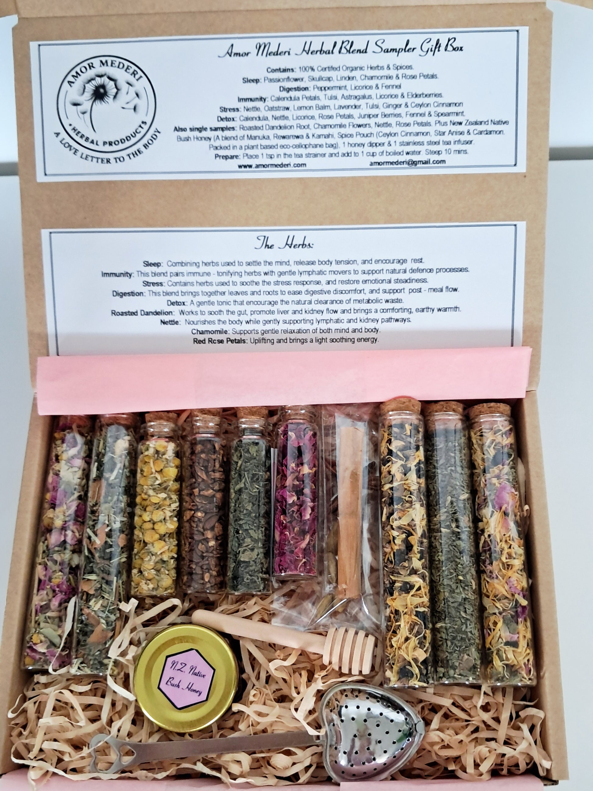 5 herbal blends, 4 single herbs, 1 spice pouch (Ceylon cinnamon, star anise and cardamom pods), 1 stainless steel herb infuser, 1 jar of N.Z. native bush honey (a blend of manuka, rewarewa and kamahi) and 1 honey dipper.